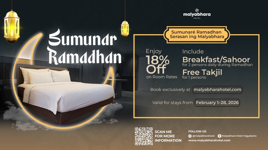 Selain itu, Malyabhara Hotel juga menawarkan promo kamar “Sumunar Ramadhan” dengan potongan harga 17% serta fasilitas sahur dan takjil gratis bagi tamu yang menginap selama periode Ramadhan 18 Februari 2026 – 18 Maret 2026.